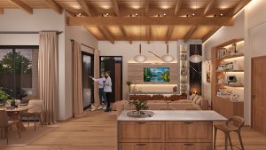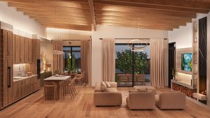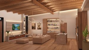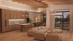 The extensive use of natural wood on the ceiling and custom furniture adds warmth and character, evoking the inviting feel of a modern cottage while maintaining a clean, contemporary aesthetic.