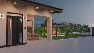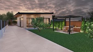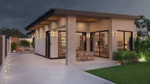 Large openings flood the interior with natural light and connect the living spaces with the serene outdoor area.