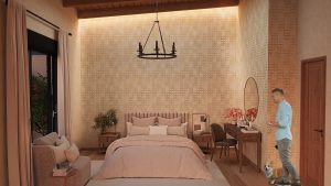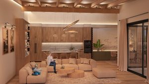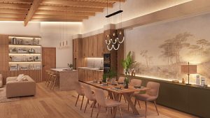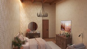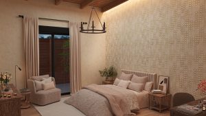 The kitchen and dining space combine natural textures, soft earthy tones, and sculptural lighting — forming the heart of the home, while in the bedroom, tactile materials and a calm palette create a peaceful retreat — an ode to timeless comfort and understated elegance.